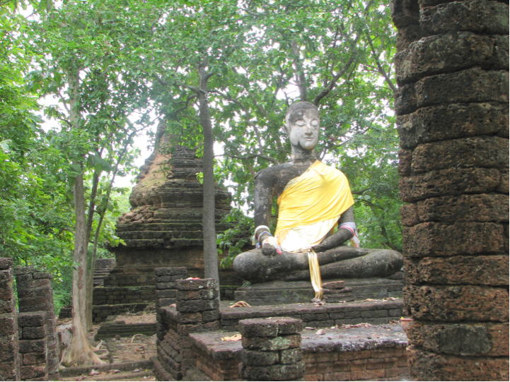 遺跡の煉瓦の色と、周りの木々の緑色とのコントラストが美しい。森の中にひっそりとある遺跡といった感じでとてもいい雰囲気。昨日廻ったスコータイの外側以上に気に入った。