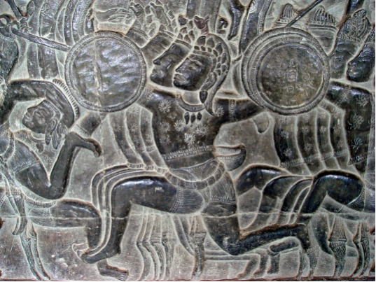 神々の戦いのレリーフ、ラーマーヤナと続けて見ていく。サル軍と悪魔軍の戦いの絵は、様々な遺跡の彫刻で見られた。この時代、彫刻するならこれ!という素材だったようだ。