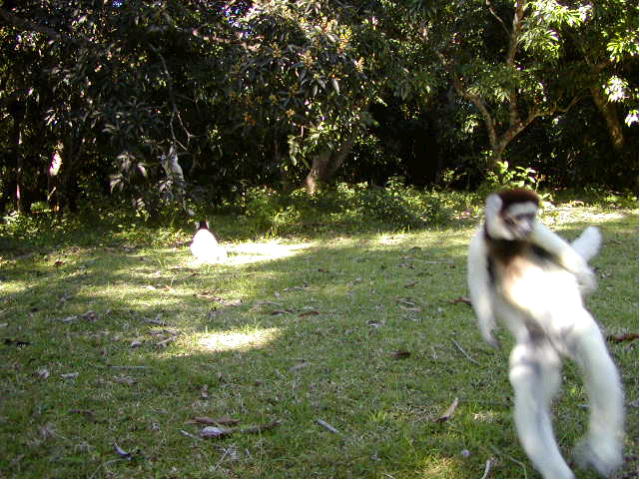 ここでのお目当ては、もちろんベローシファカ。歩き出して、15分ぐらいだっただろうか。さっそくベローシファカの群れに出会った。