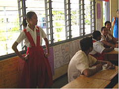 サモアの小学校は、1〜8年生まであり、ここの学校の児童数は約900人。さっそく、授業の様子を見学する。各学年は、2または3クラスで、すべて能力別編成。教室に入ると先生が、「ここは、○年生の1番下のクラス」とか、子どもの前ではっきり言うのにびっくりした。