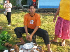 テーブルに、ずらっと並んだウム料理。種類が多いので、できるだけ少しづつ、多くの種類をいただく。おいしかったのは、バルサミ(ヤムイモの葉でココナツを包んだもの)、タコ、ブタのレバー、鶏のスープ、蒸したパンの実など。時間がもう少し遅くて、お腹が空いてたら、もっとたくさん食べられたのに・・・